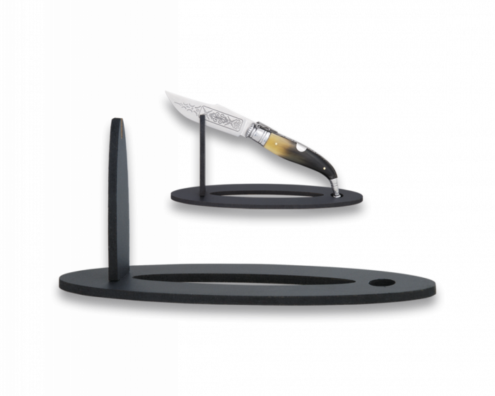 Cuțitele Crichet.ro cu mâner din corn, lamă gravată și finisaje atent lucrate se așază perfect pe acest suport, armonizând tradiția cu un cadru elegant.
